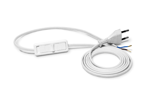 Przewód elektryczny z włącznikiem i wtyczką przygotowany w czarnym lub biały kolorze.