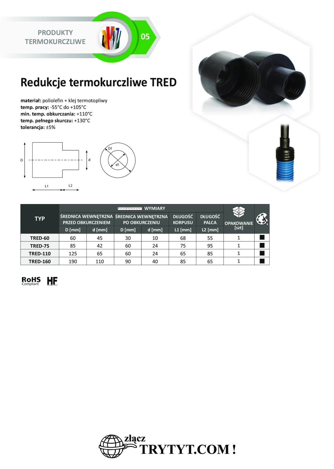 Redukcje termokurczliwe TRED wykonane z poliolefiny oraz kleju termotopliwego.