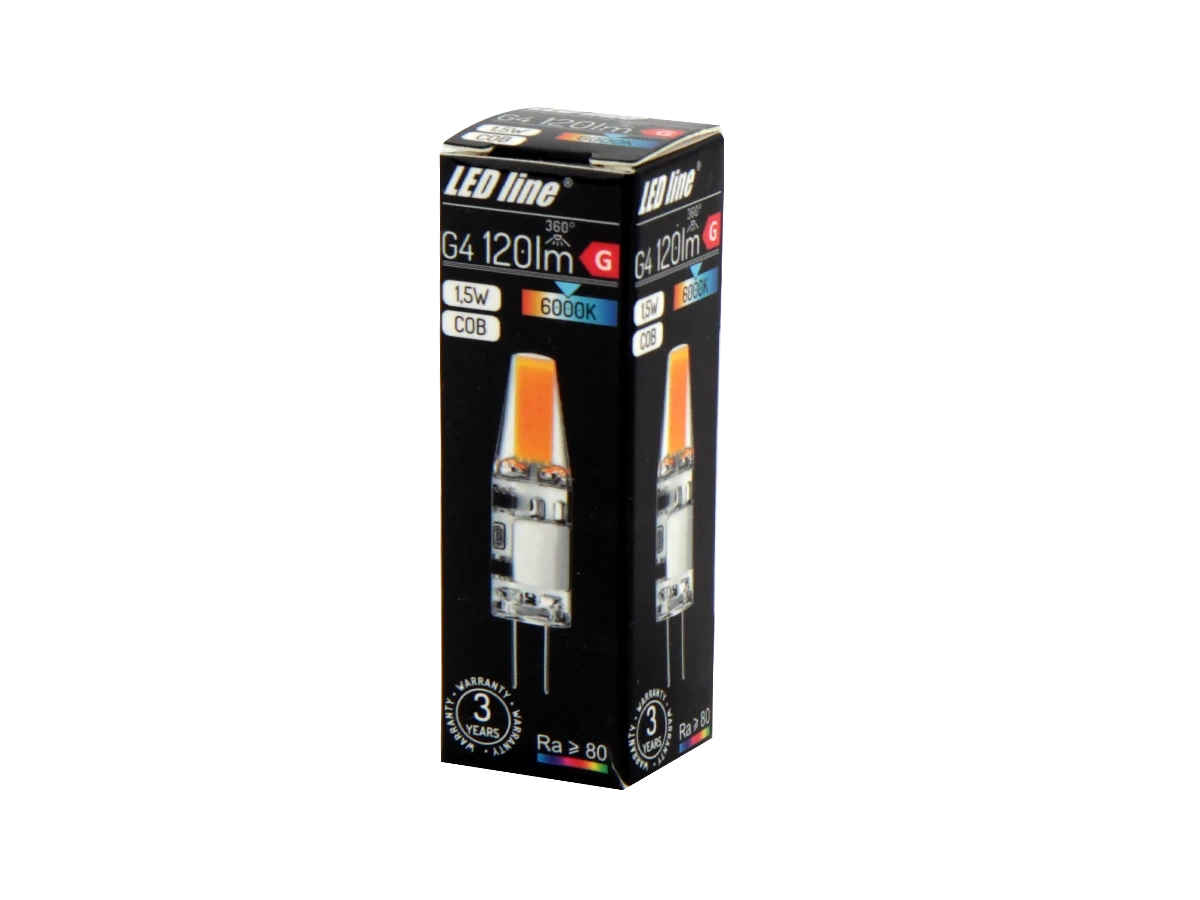 Żarówka LED G4 COB 1,5W 6000K marki LED line LITE to nowoczesne i energooszczędne źródło światła, które doskonale sprawdzi się w różnorodnych zastosowaniach wewnętrznych. Dzięki wykorzystaniu technologii COB (Chip On Board), żarówka oferuje wysoki całkowity strumień świetlny na poziomie 120 lm przy niskim poborze mocy wynoszącym zaledwie 1,5 W. Charakteryzuje się barwą światła o temperaturze 6000 K, zapewniając chłodną, białą poświatę idealną do miejsc wymagających precyzyjnego oświetlenia.