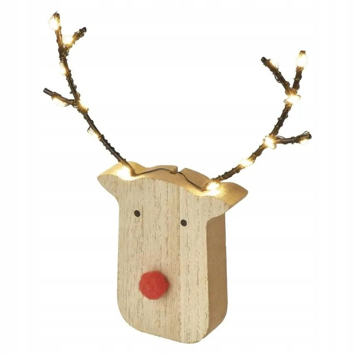Wnieś świąteczną magię do swojego domu dzięki oryginalnej drewnianej dekoracji w postaci renifera z oświetlonym porożem! Ten minimalistyczny i elegancki element wykonany z prawdziwego drewna odświeży każde wnętrze i stworzy przytulną świąteczną atmosferę dzięki ciepłemu białemu światłu. Idealna na półkę, stół lub witrynę. Dekoracja wyposażona jest również w wyłącznik czasowy i zasilana jest 2× bateriami AAA dołączonymi do zestawu, dzięki czemu jest gotowa do natychmiastowego użycia.Dane techniczne: