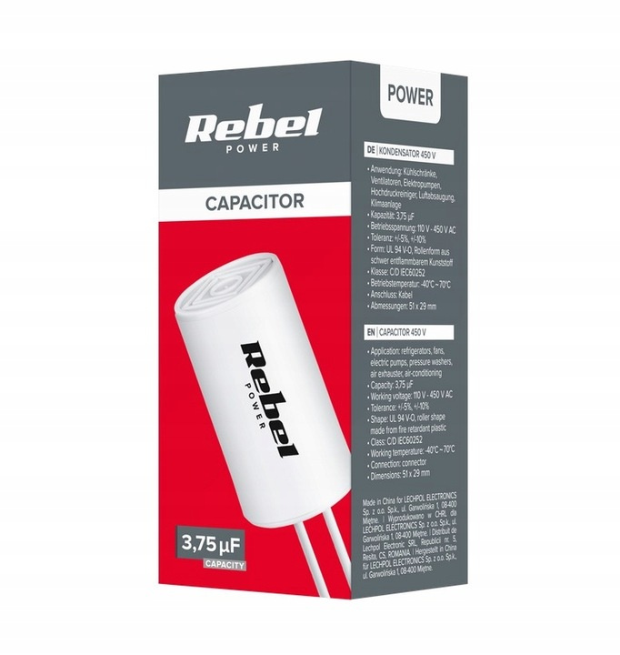 Wysokiej jakości kondensator rozruchowy o pojemności 3,75 μF, przeznaczony do szerokiego zastosowania w urządzeniach elektrycznych, takich jak: lodówki, wentylatory, pompy elektryczne, myjki ciśnieniowe, wywietrzniki oraz systemy klimatyzacyjne
