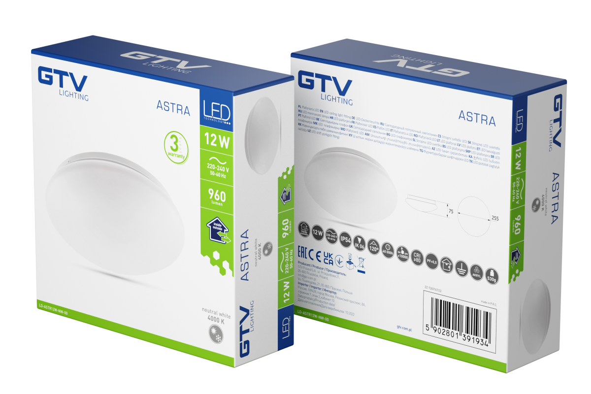 Plafoniera wytwarza naturalne dla oka światło na poziomie 4000K i CRI>80 sprzyjające skupieniu i pracy. Stopień ochrony IP54 sprawia, że Plafoniera ASTRA jest odpowiednia do montażu wewnątrz oraz na zewnatrz budynków, jest odporna na wilgoć i kurz. Żywotność oprawy wynosi 40 000 godzin i co najmniej 10 000 cykli włącz/wyłącz z trzy letnią gwarancją.